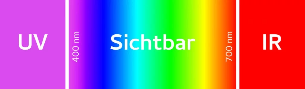 La parte dello spettro elettromagnetico che possiamo vedere con i nostri occhi è molto limitata. La nostra percezione avviene tra circa 400 nm (viola) e circa 700 nm (rosso) di lunghezza d'onda, il resto purtroppo rimane nascosto. Direttamente adiacente alla gamma visibile (nota anche come gamma VIS) c'è la gamma del vicino ultravioletto e dell'infrarosso.